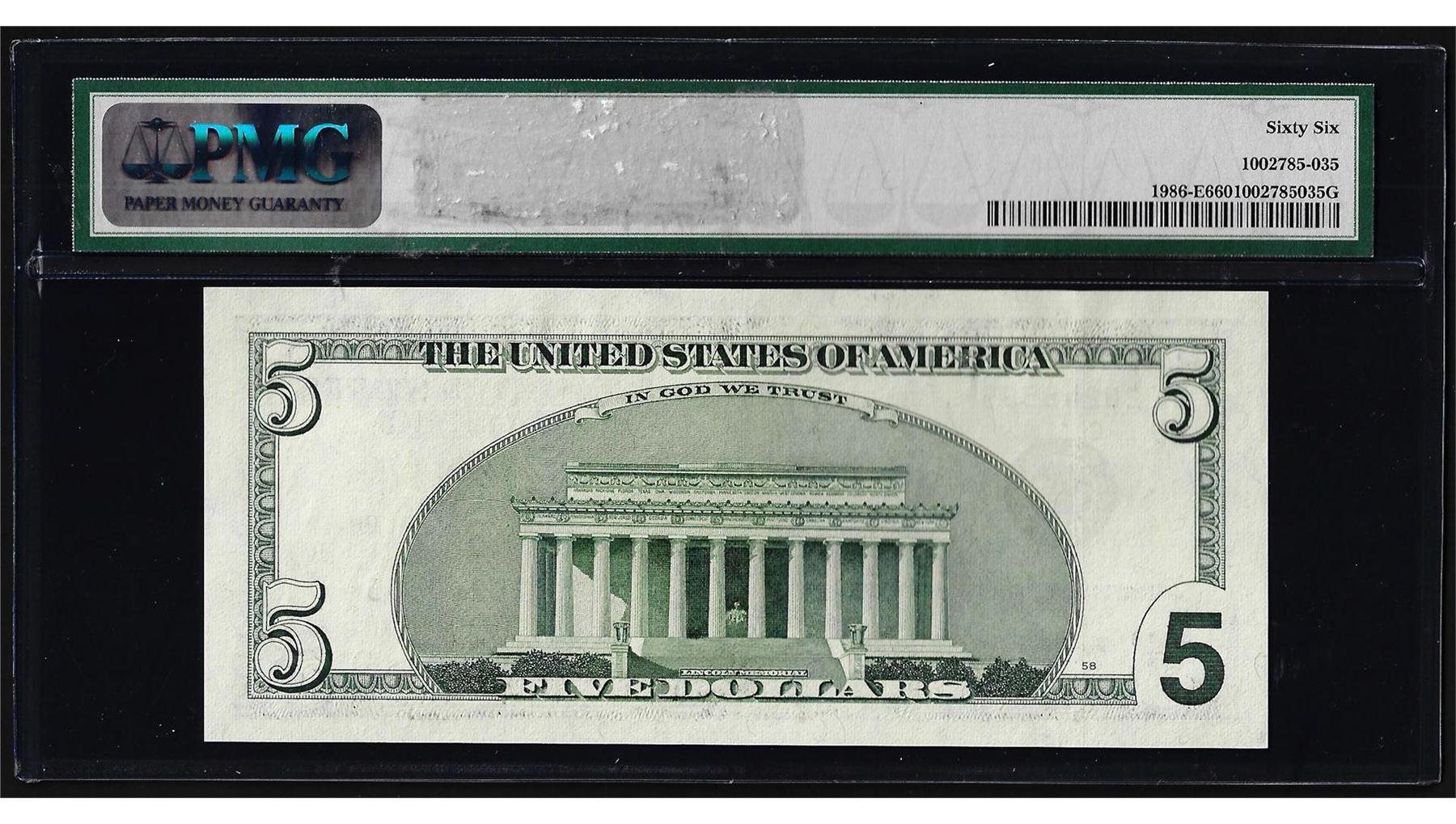 1999 $5 Federal Reserve Star Note Fr.1986-E PMG Gem Uncirculated 66EPQ
