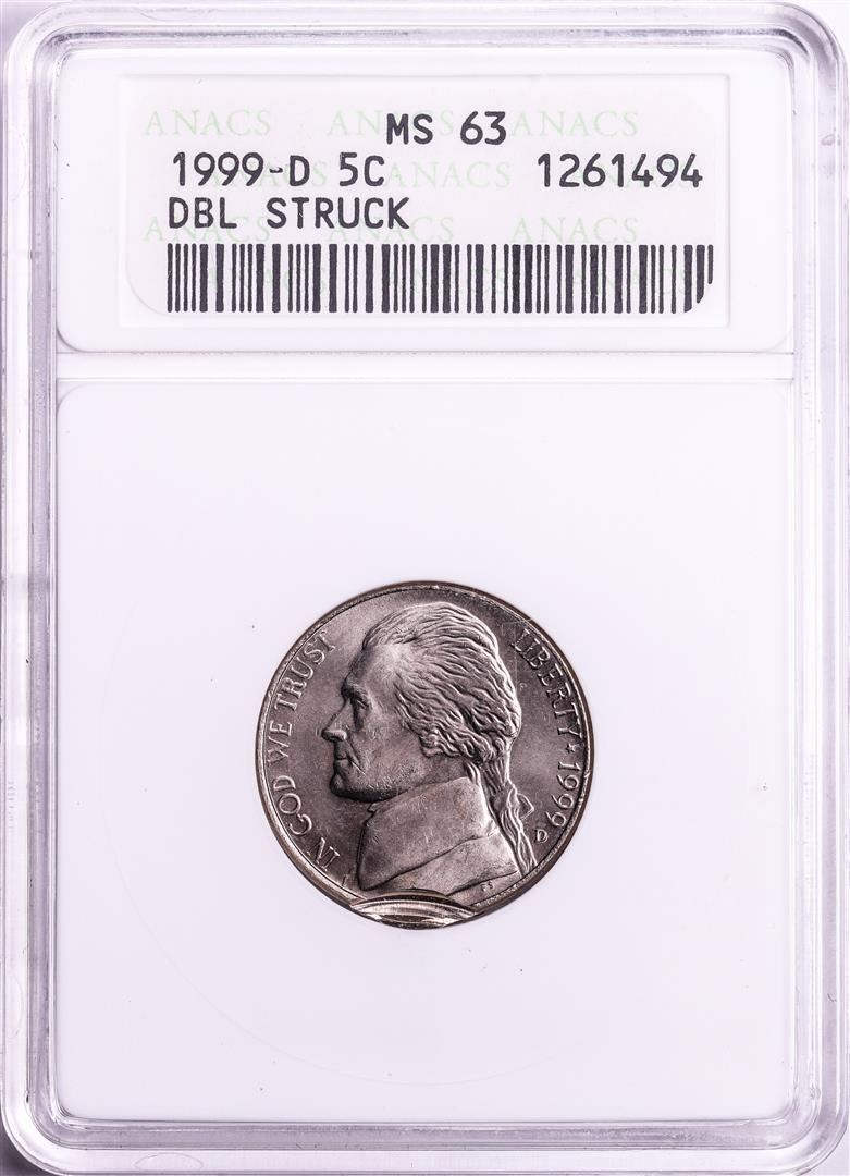 One 1999-D Double Struck Jefferson Nickel Error Coin ANACS MS63. ANACS Certified.