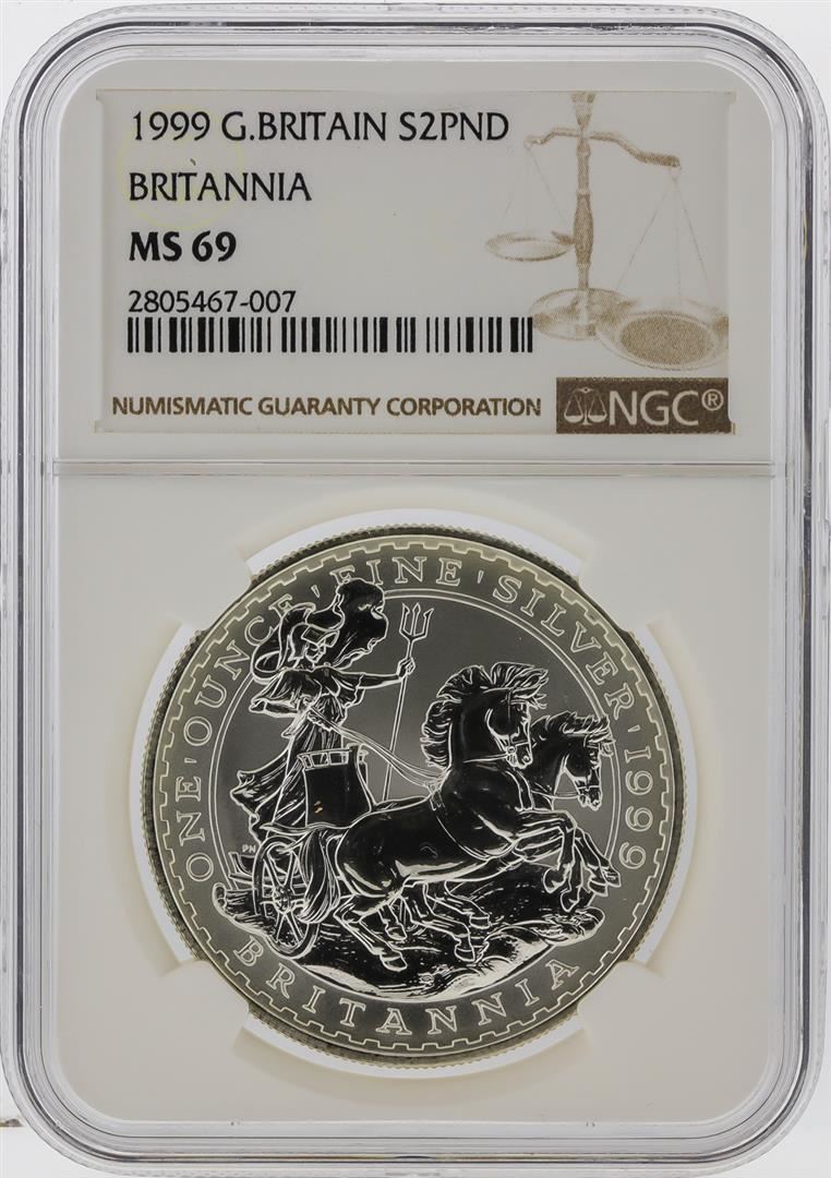 One 1999 Great Britain 2 Pound Britannia Silver Coin NGC MS69. NGC Certified.
