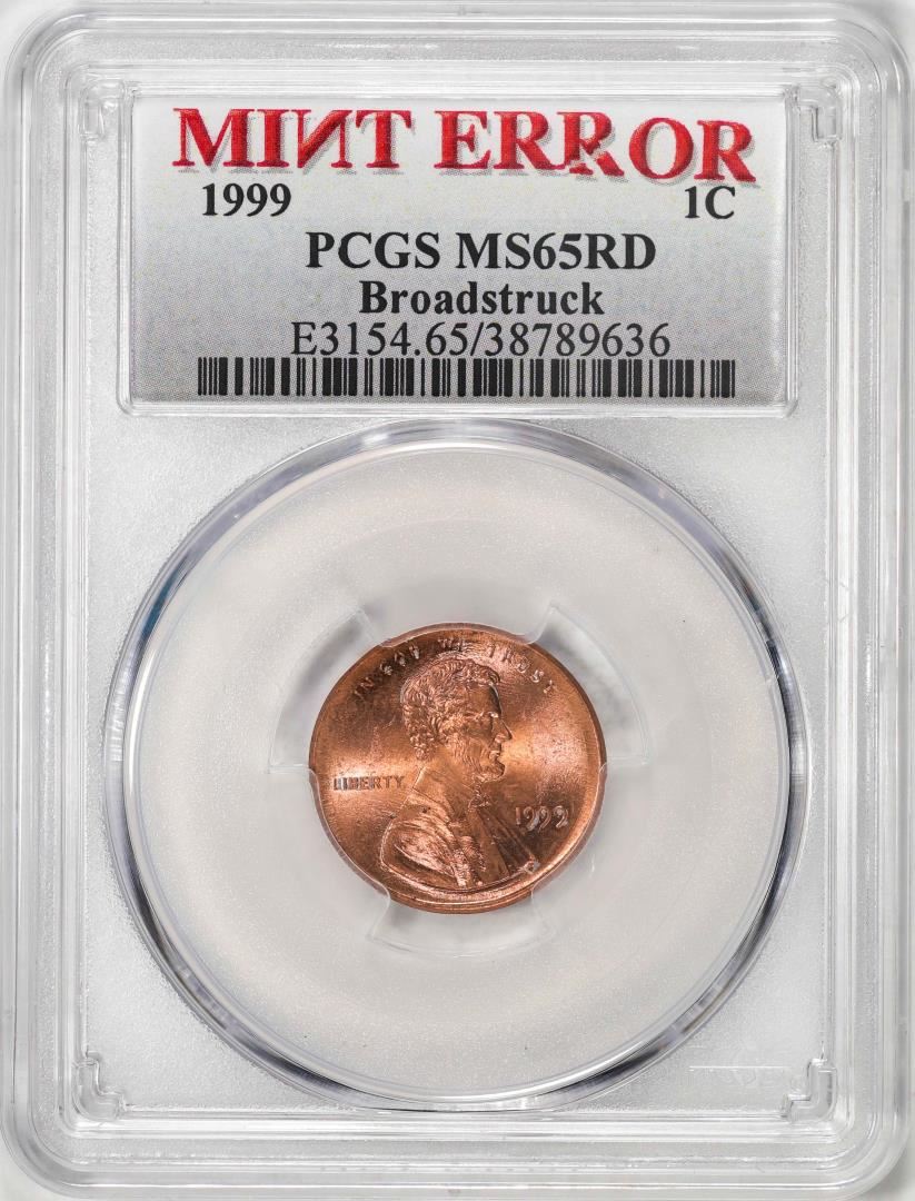 One 1999 Lincoln Memorial Cent Coin Mint Error Broadstruck PCGS MS65RD. PCGS Graded.