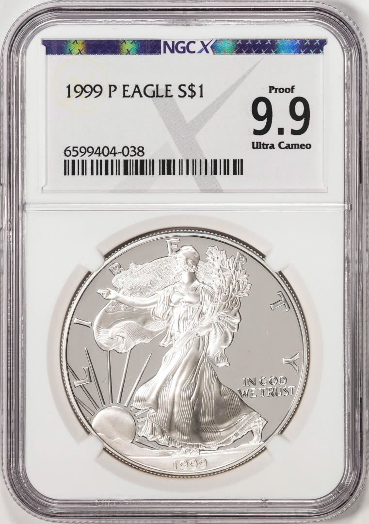 One 1999-P $1 Proof American Silver Eagle Coin NGCX Proof 9.9 Ultra Cameo. NGCX Certified.