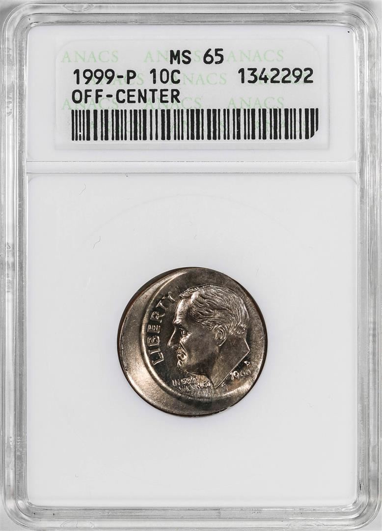 1999-P Roosevelt Dime Coin Mint ERROR Stuck Off Center ANACS MS65