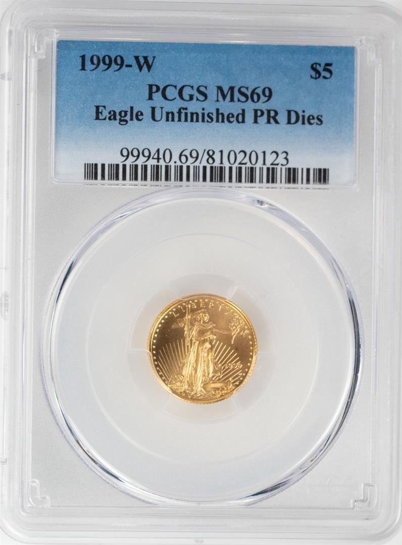 One 1999-W $5 American Gold Eagle Coin PCGS MS69 Unfinished PR Die. PCGS Graded.