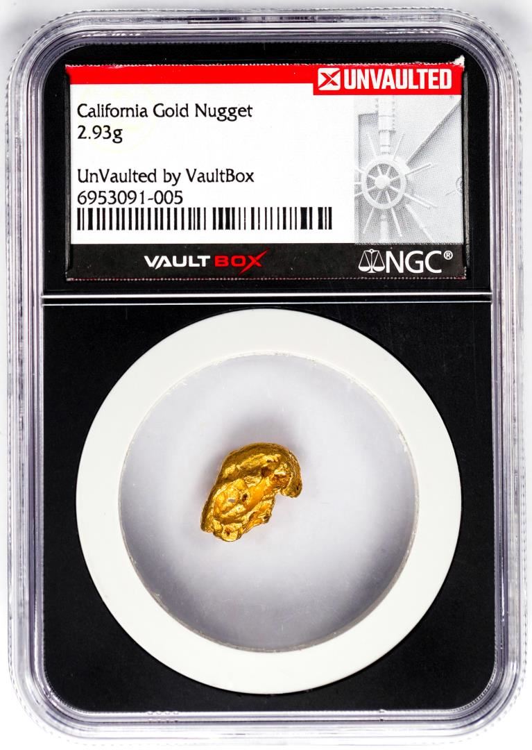 One 2.93 Gram California Gold Nugget NGC Vaultbox Unvaulted. NGC Certified.