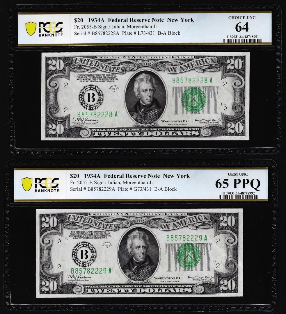 One (2) Cons. 1934A $20 Federal Reserve Notes PCGS Uncirculated 64/65PPQ Plate Change. PCGS Graded.