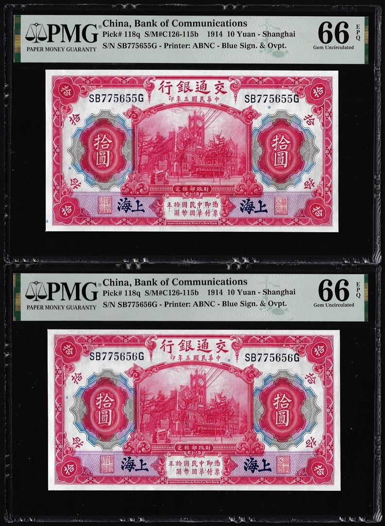 (2) Consec. 1914 China Bank of Communications 10 Yuan Notes PMG Gem Uncirculated 66EPQ