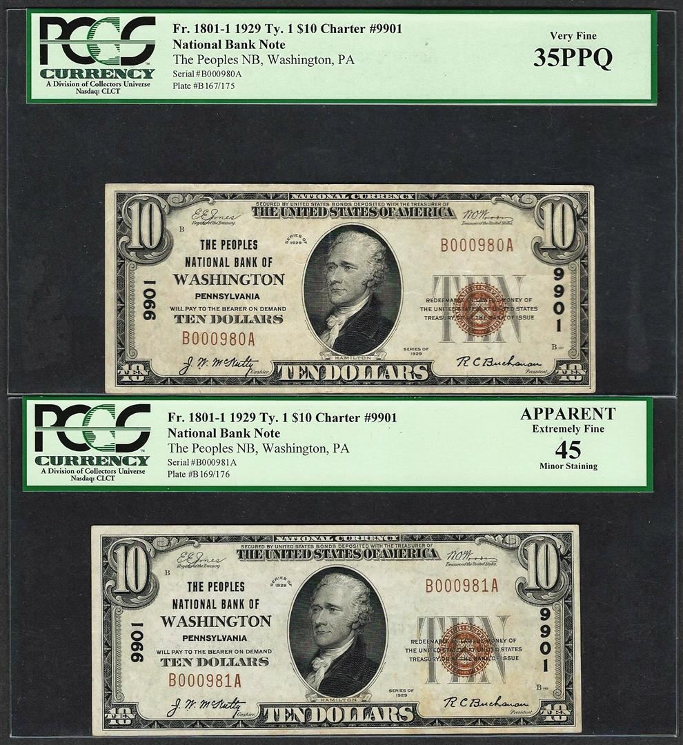 (2) Consec. 1929 $10 Washington, PA CH# 9901 National Currency Notes PCGS VF35PPQ/45