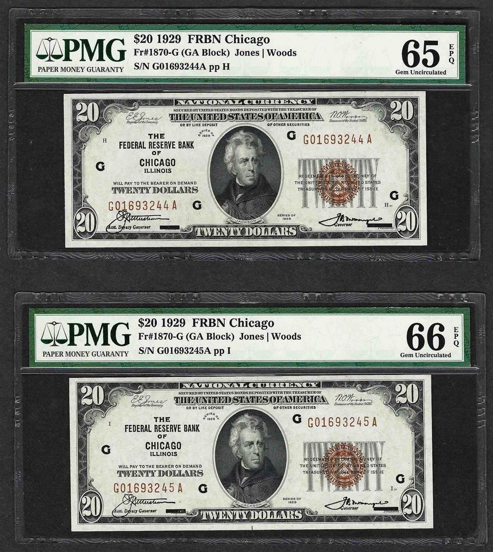 One Lot of (2) Consec. 1929 $20 Federal Reserve Bank Chicago Notes PMG Gem Uncirculated 65/66EPQ. PMG Certified.