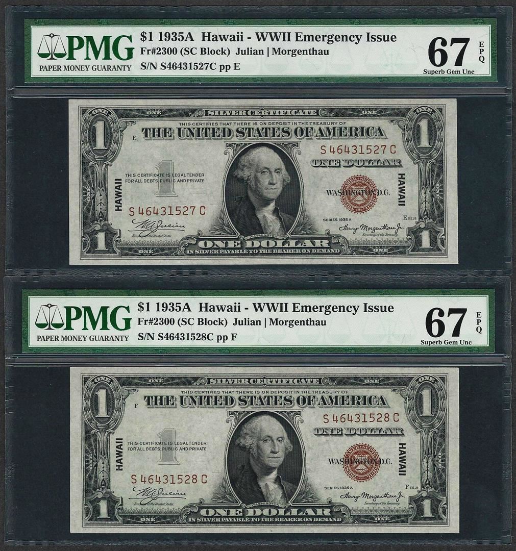 One (2) Consec. 1935A $1 Hawaii Emergency Silver Certificate Notes PMG Superb Gem Unc 67EPQ. PMG Certified.