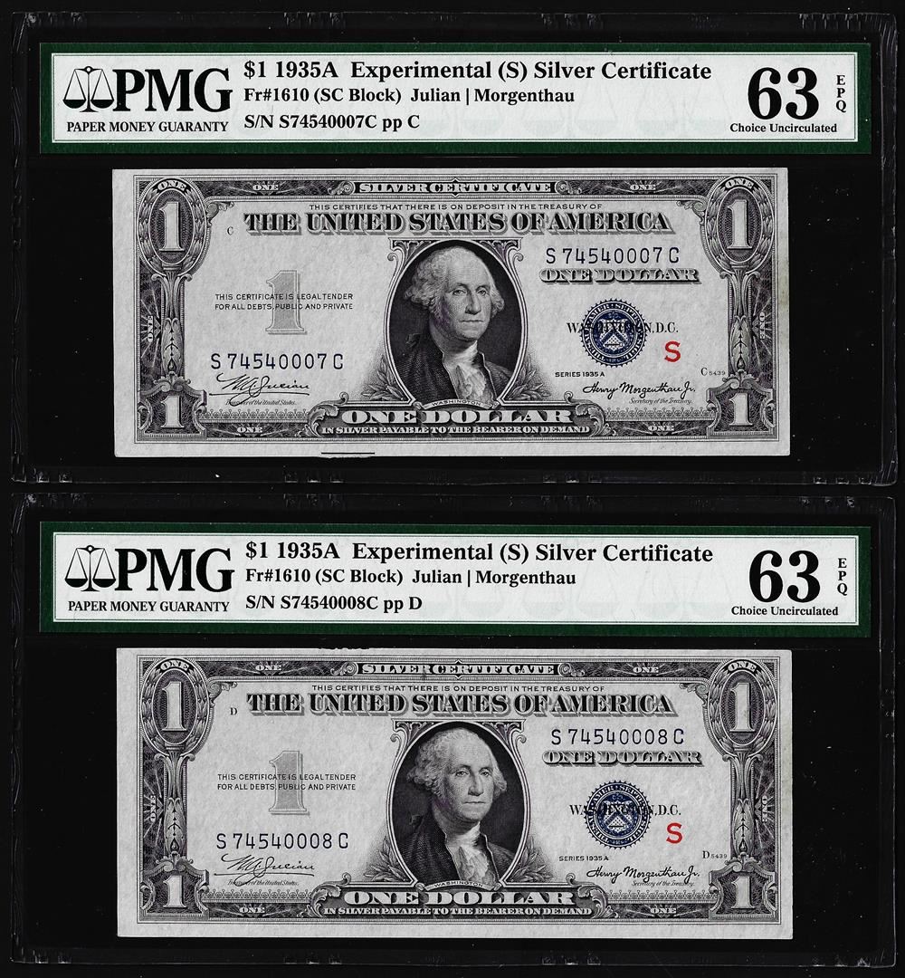 (2) Consec. 1935A $1 "S" Experimental Silver Certificate Notes PMG Uncirculated 63EPQ