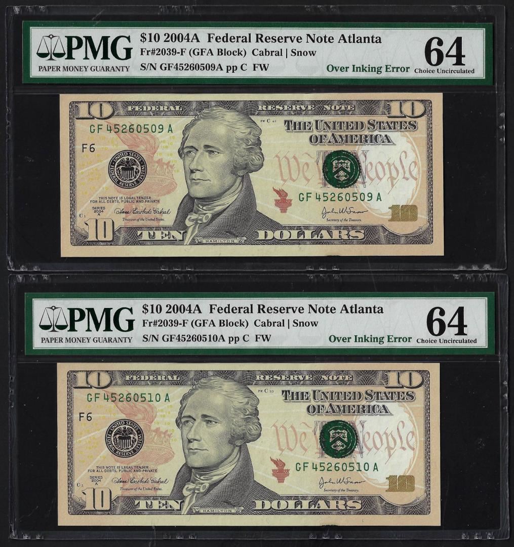 One (2) Consec. 2004A $10 Federal Reserve Over Inking Error Notes PMG Ch. Uncirculated 64. PMG Certified.