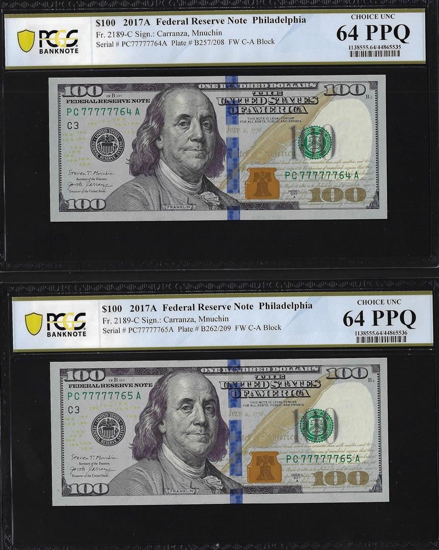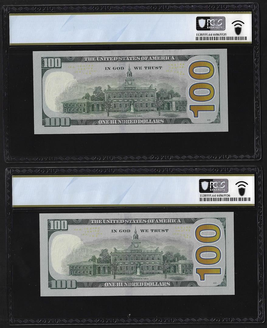 (2) Consec. 2017A $100 Federal Reserve Bank Notes PCGS Choice Unc. 64PPQ Fancy Serial