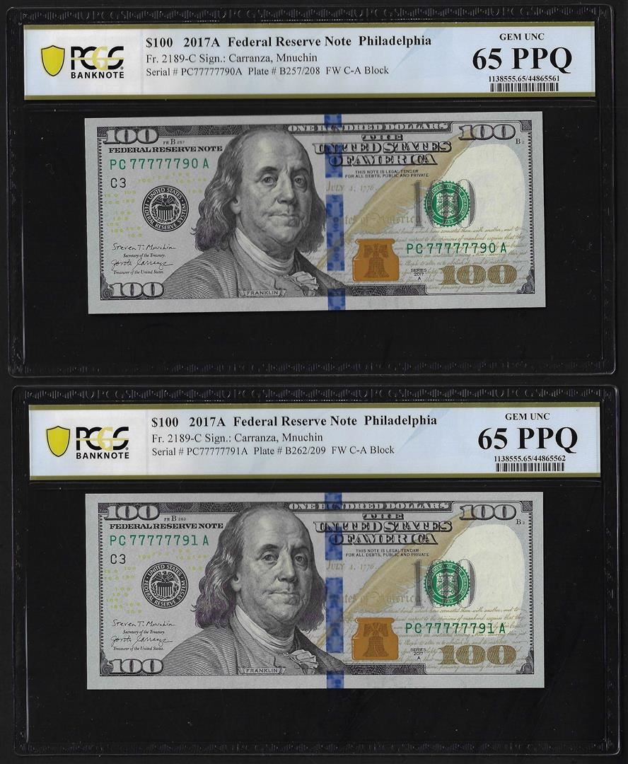 One (2) Consec. 2017A $100 Federal Reserve Bank Notes PCGS Gem Unc. 65PPQ Fancy Serial. PCGS Graded.