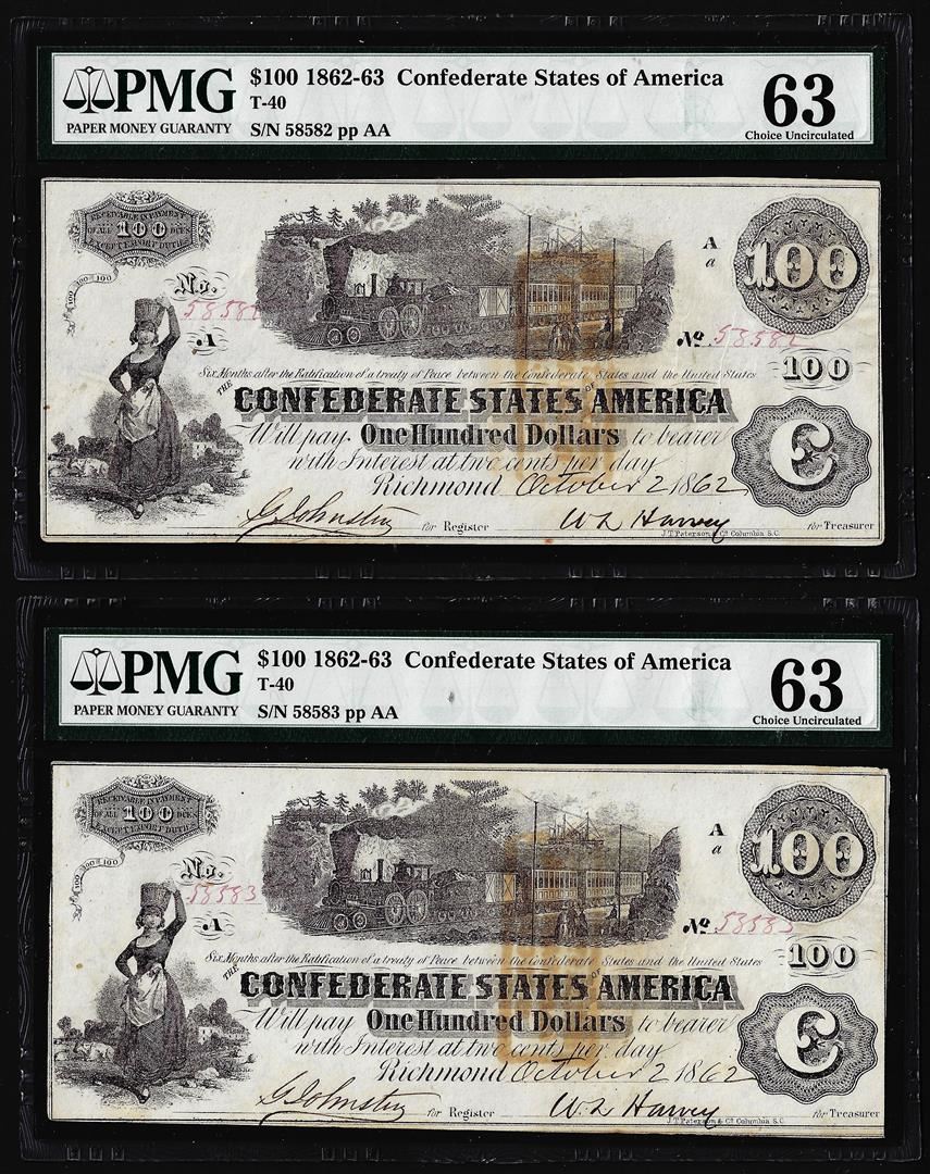 One (2) Consecutive 1862 $100 Confederate States of America Notes PMG Choice Uncirculated 63. PMG Certified.
