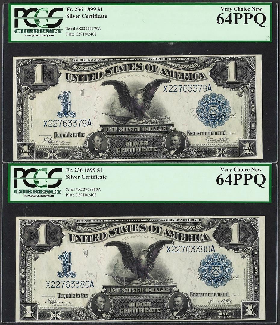 One (2) Consecutive 1899 $1 Black Eagle Silver Certificate Note PCGS Choice New 64PPQ. PCGS Graded.