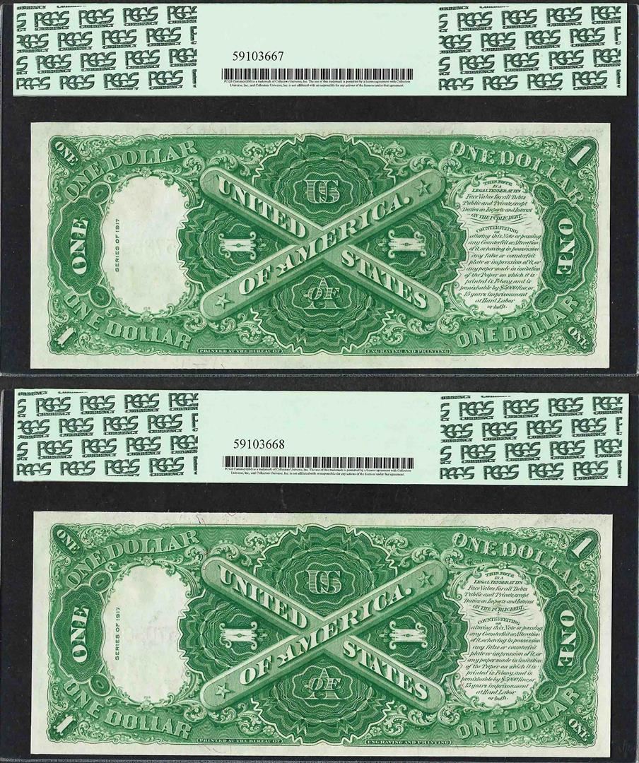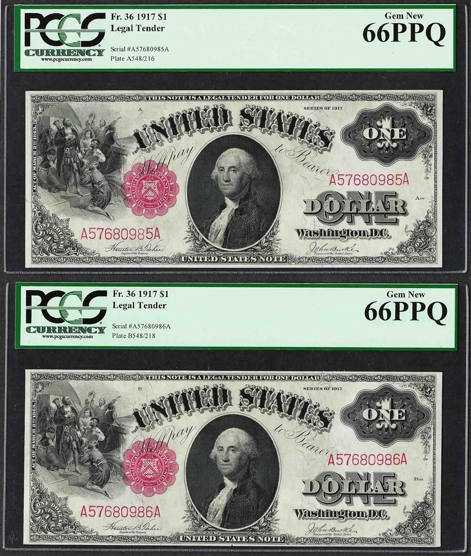 One (2) Consecutive 1917 $1 Legal Tender Notes Fr.36 PCGS Gem New 66PPQ. PCGS Graded.