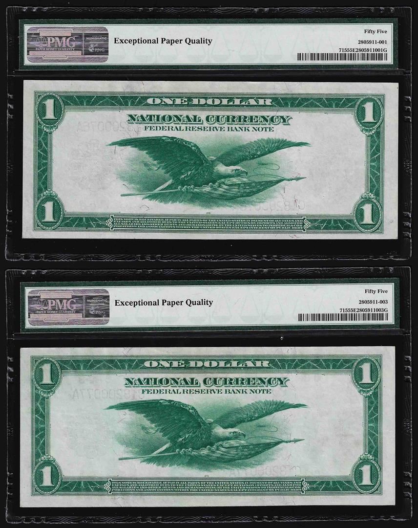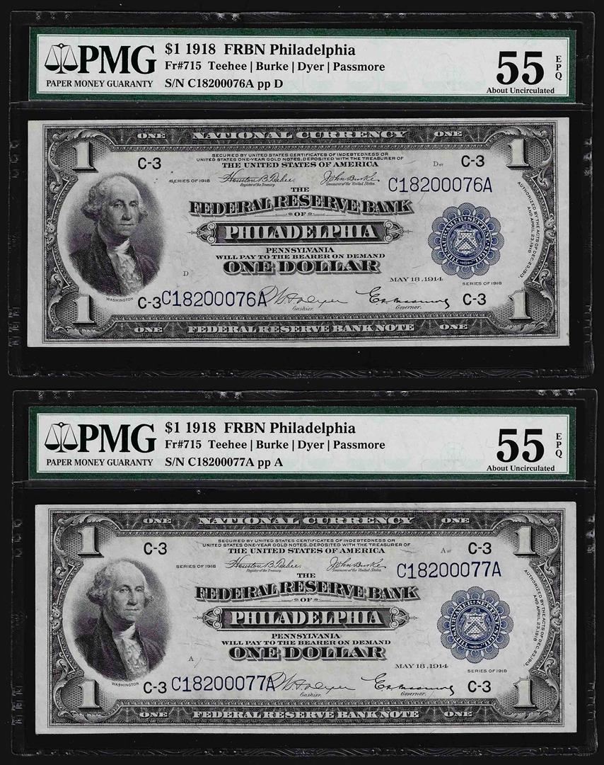 One (2) Consecutive 1918 $1 Federal Reserve Bank Notes Philadelphia PMG About Unc. 55EPQ. PMG Certified.