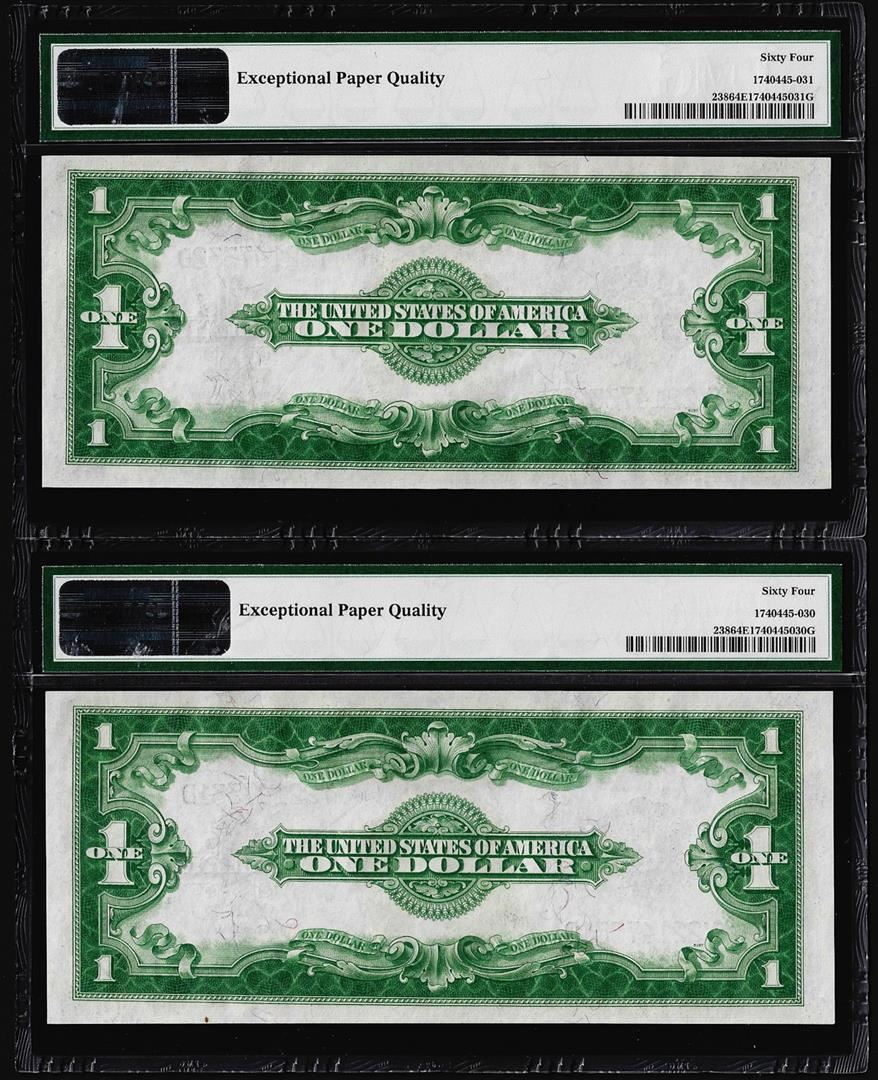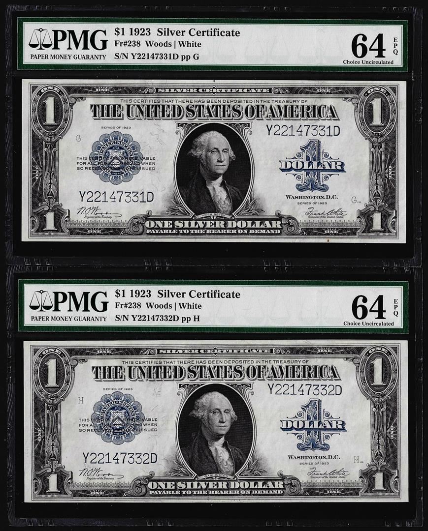 One (2) Consecutive 1923 $1 Silver Certificate Note Fr.238 PMG Choice Uncirculated 64EPQ. PMG Certified.