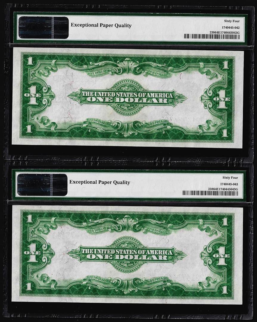 One (2) Consecutive 1923 $1 Silver Certificate Note Fr.238 PMG Choice Uncirculated 64EPQ. PMG Certified.