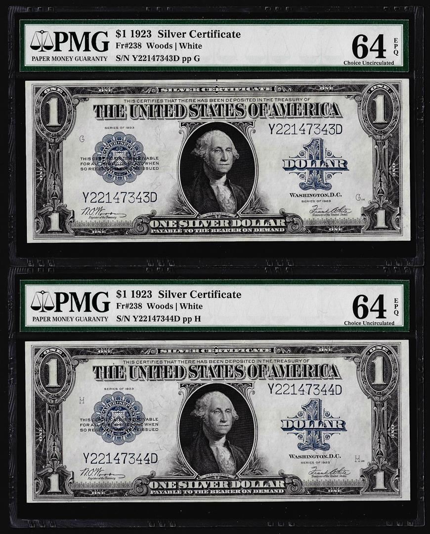 One (2) Consecutive 1923 $1 Silver Certificate Note Fr.238 PMG Choice Uncirculated 64EPQ. PMG Certified.