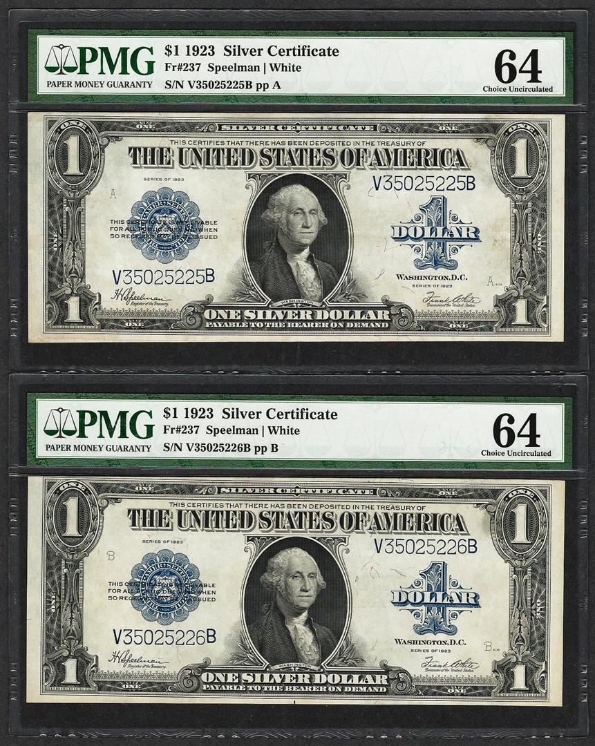 One (2) Consecutive 1923 $1 Silver Certificate Notes Fr.237 PMG Choice Uncirculated 64. PMG Certified.