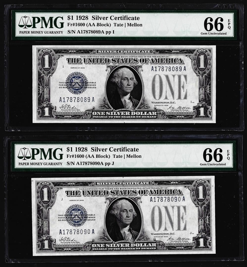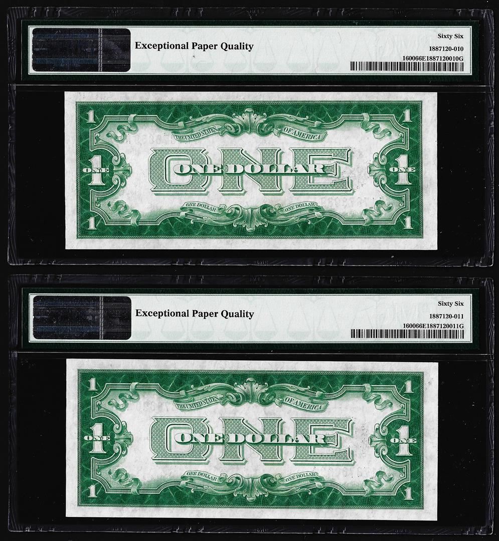 One (2) Consecutive 1928 $1 Funnyback Silver Certificate Notes PMG Gem Uncirculated 66EPQ. PMG Certified.