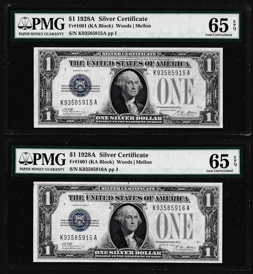 One (2) Consecutive 1928A $1 Funnyback Silver Certificate Notes Fr.1601 PMG Gem Uncirculated 65EPQ. PMG Certified.