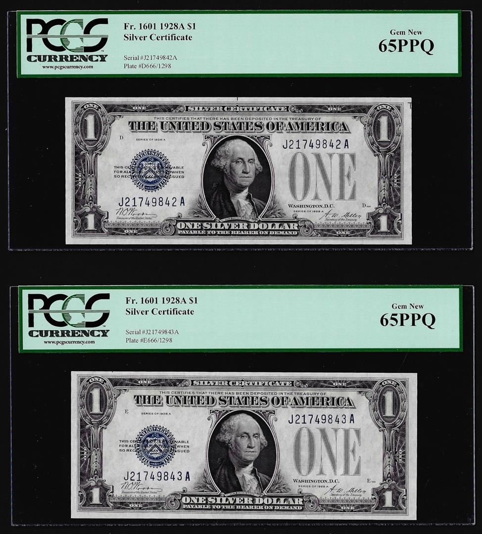 (2) Consecutive 1928A $1 Funnyback Silver Certificate Notes PCGS Gem New 65PPQ