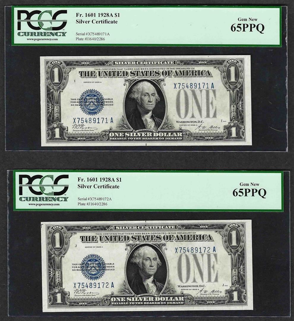 (2) Consecutive 1928A $1 Funnyback Silver Certificate Notes PCGS Gem New 65PPQ