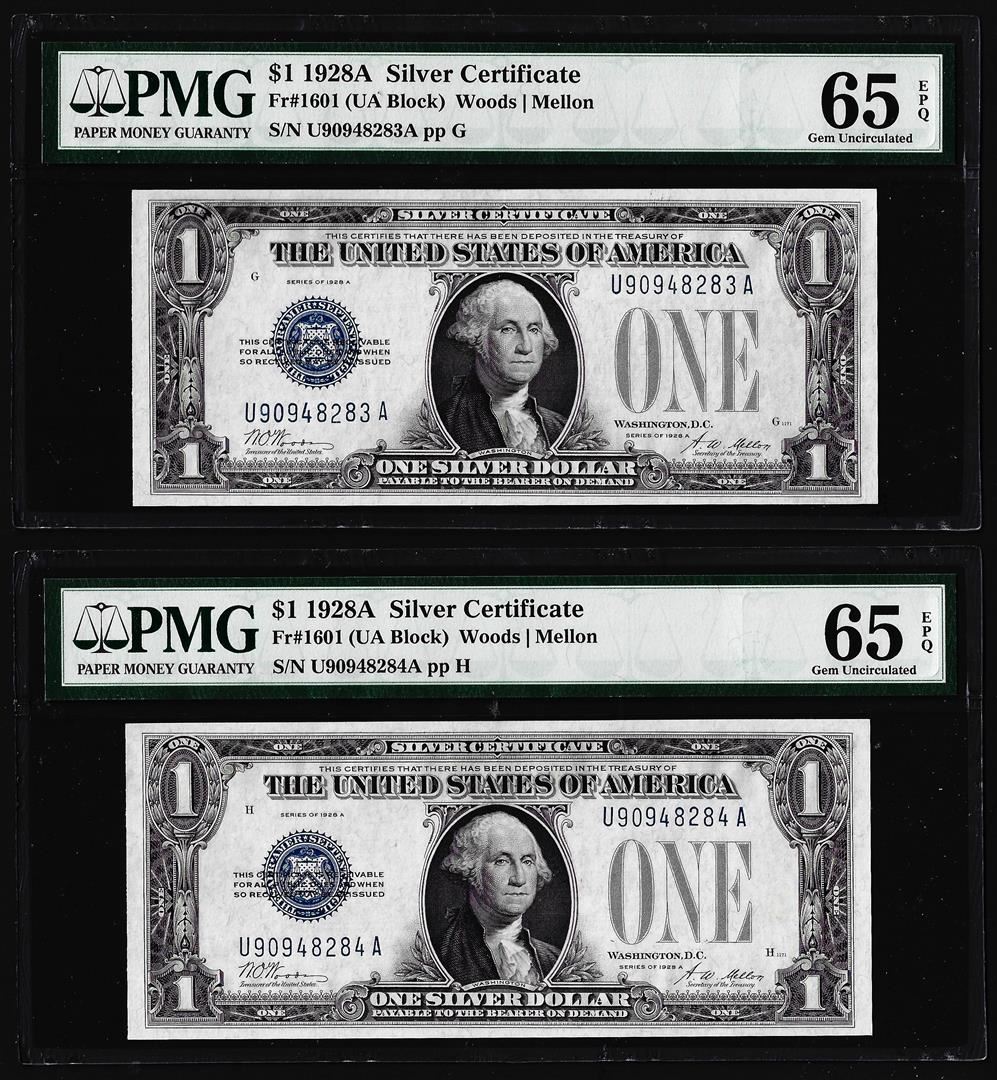 One (2) Consecutive 1928A $1 Silver Certificate Notes Fr.1601 PMG Gem Uncirculated 65EPQ. PMG Certified.