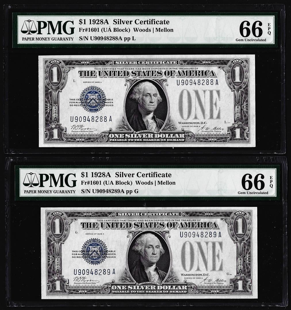 One (2) Consecutive 1928A $1 Silver Certificate Notes Fr.1601 PMG Gem Uncirculated 66EPQ. PMG Certified.
