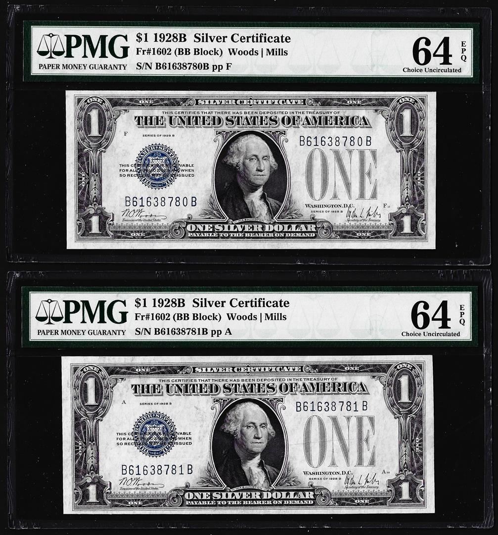 One (2) Consecutive 1928B $1 Silver Certificate Notes Fr.1602 PMG Choice Uncirculated 64EPQ. PMG Certified.