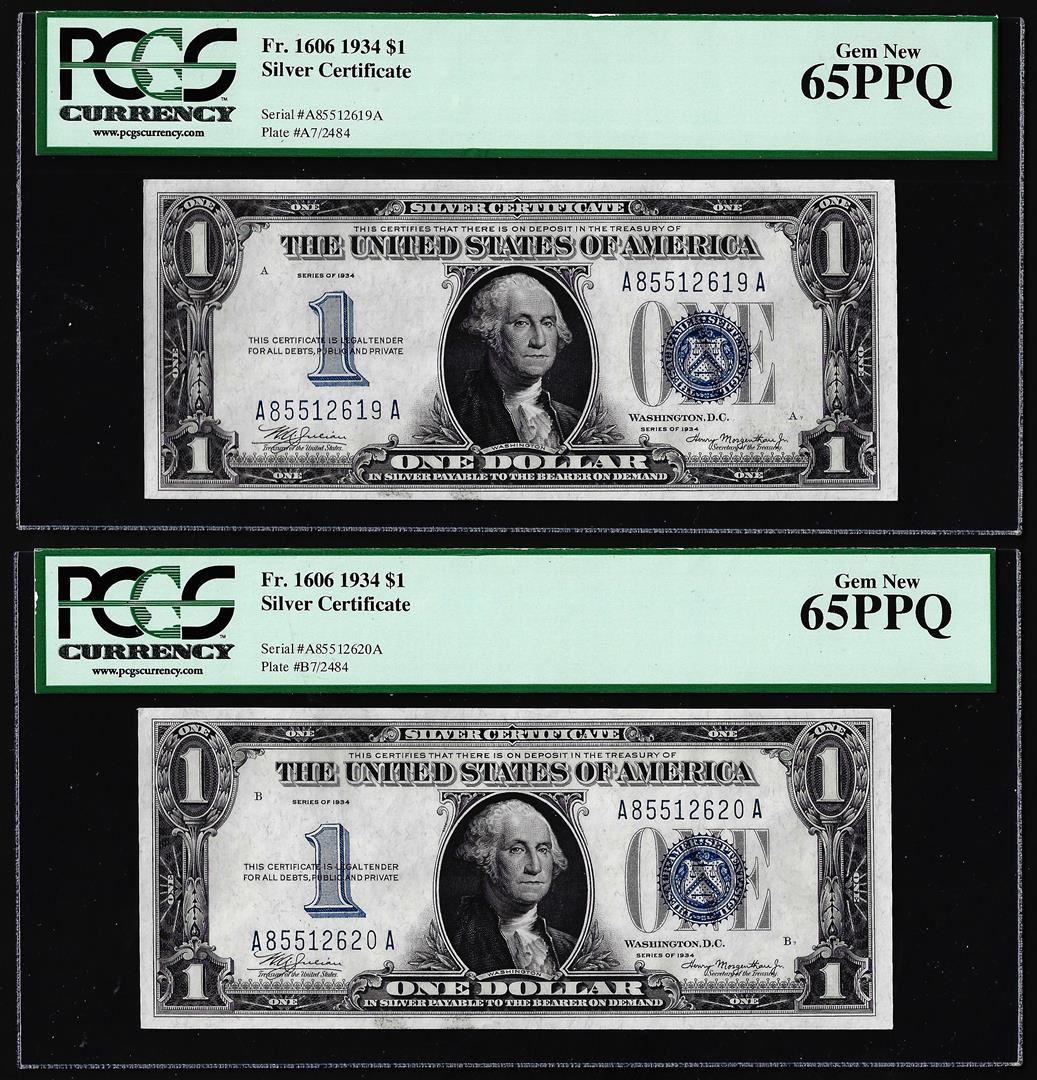 (2) Consecutive 1934 $1 Funnyback Silver Certificate Notes FR.1606 PCGS Gem New 65PPQ