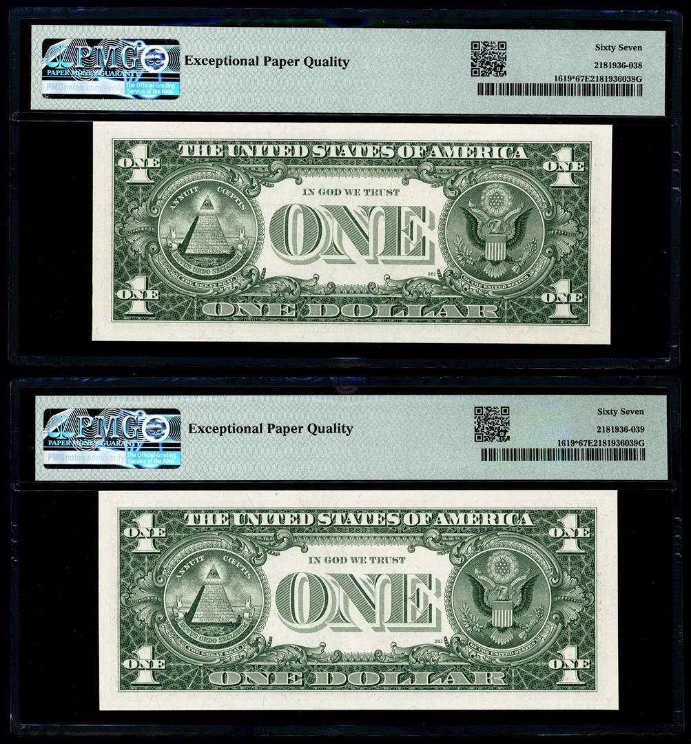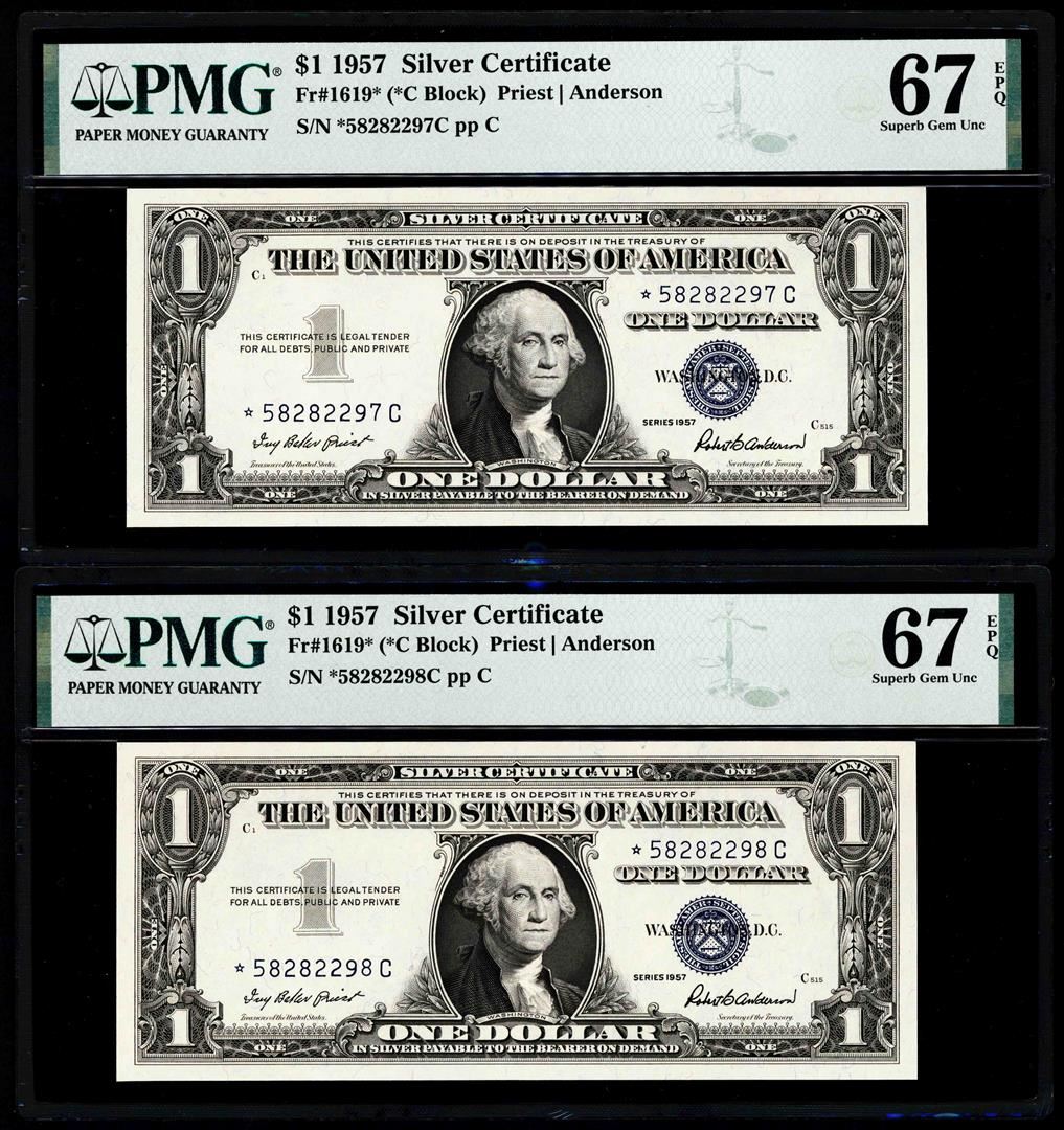 Lot of (2) Consecutive 1957 $1 Silver Certificate Star Notes Fr.1619* PMG Superb Gem Uncirculated 67EPQ. PMG Certified.
