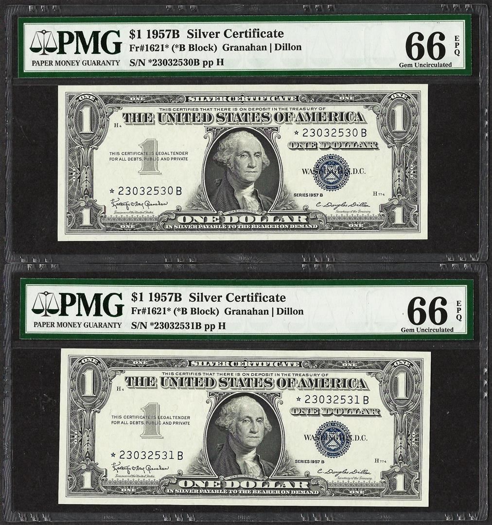 (2) Consecutive 1957B $1 Silver Certificate STAR Notes PMG Gem Uncirculated 66EP