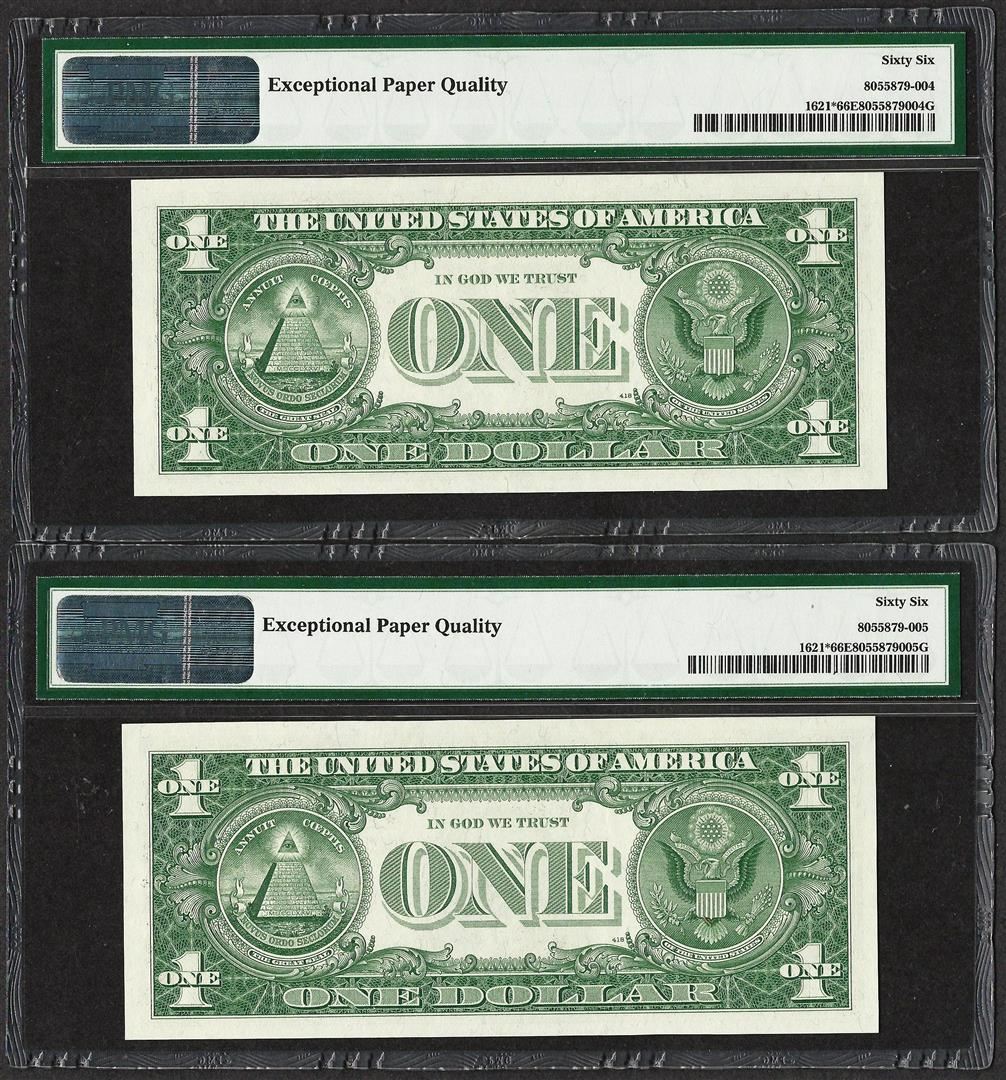 One (2) Consecutive 1957B $1 Silver Certificate STAR Notes PMG Gem Uncirculated 66EPQ. PMG Certified.