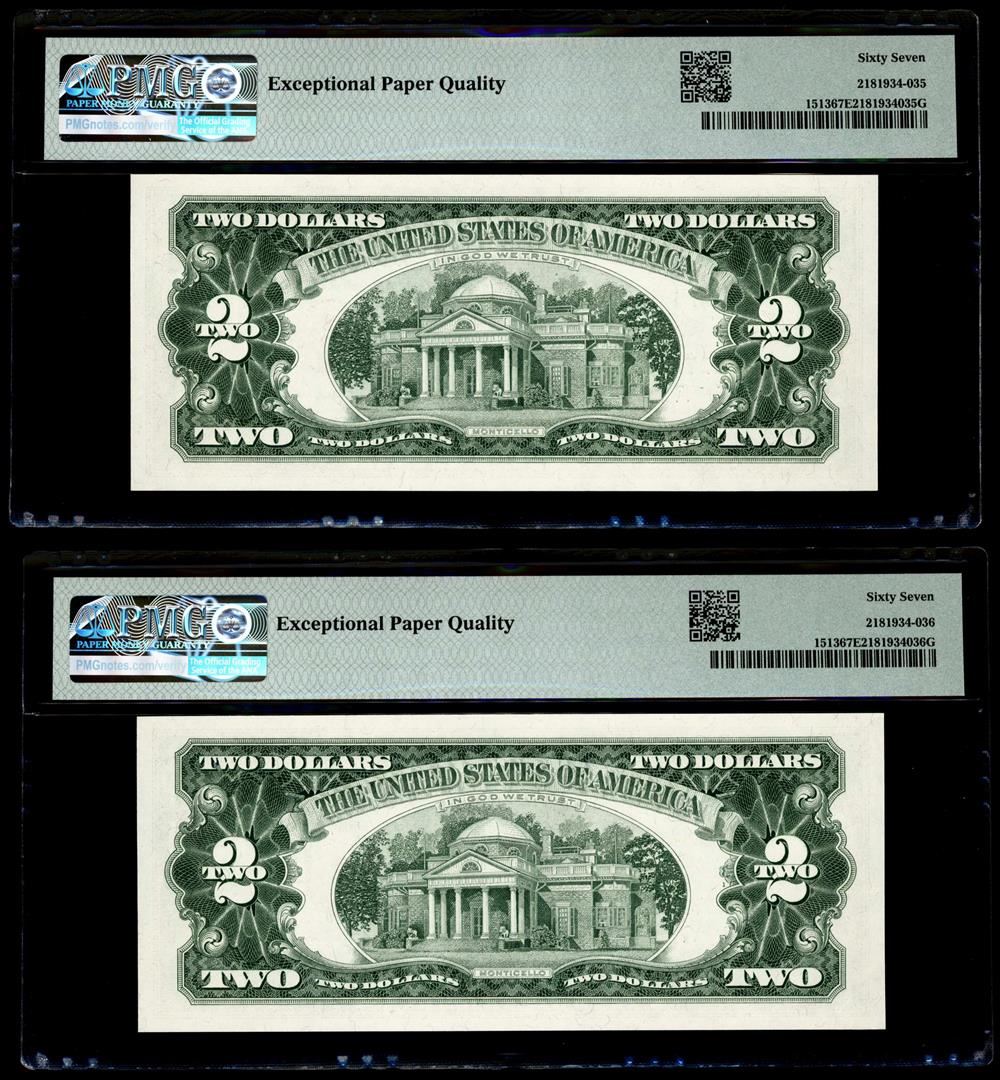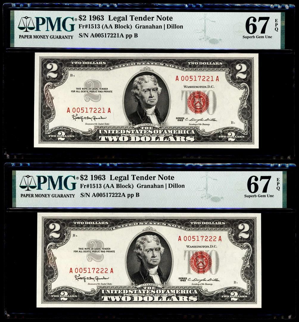 Lot of (2) Consecutive 1963 $2 Legal Tender Notes Fr.1513 PMG Superb Gem Uncirculated 67EPQ. PMG Certified.