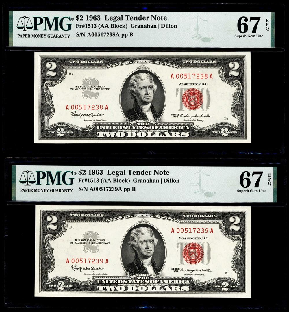 Lot of (2) Consecutive 1963 $2 Legal Tender Notes Fr.1513 PMG Superb Gem Uncirculated 67EPQ. PMG Certified.