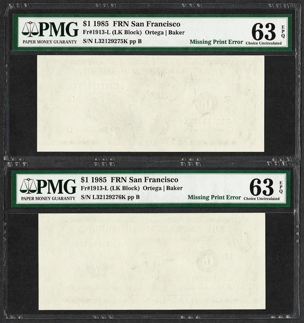 One (2) Consecutive 1985 $1 Federal Reserve Notes ERROR Blank Reverse PMG Choice Unc 63EPQ. PMG Certified.