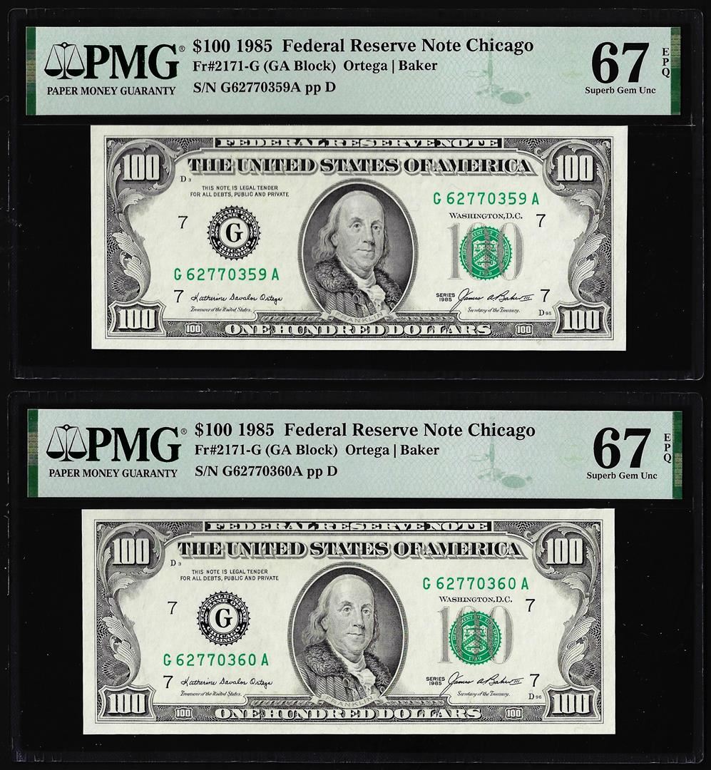 One (2) Consecutive 1985 $100 Federal Reserve Notes Fr.2171-G PMG Superb Gem Unc 67EPQ. PMG Certified.
