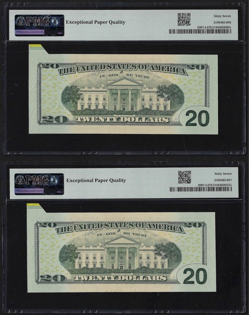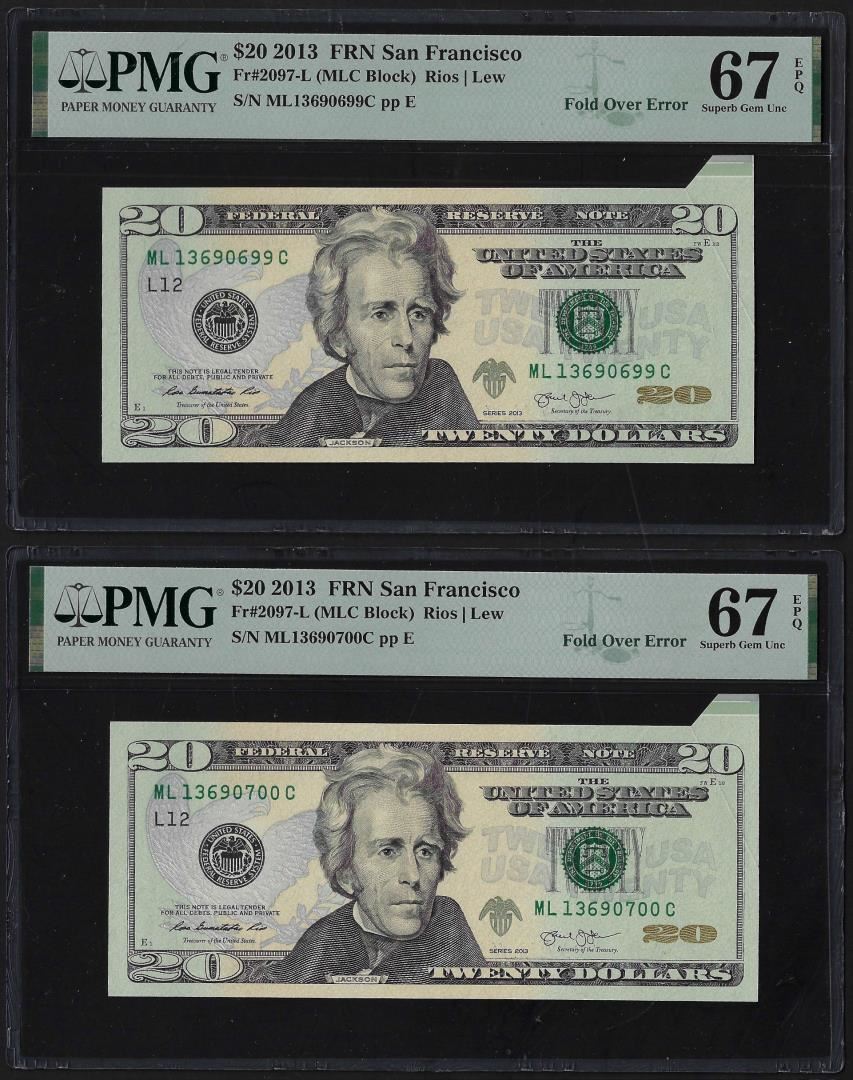 One (2) Consecutive 2013 Federal Reserve Fold Over Error Notes PMG Superb Gem Unc 67EPQ. PMG Certified.