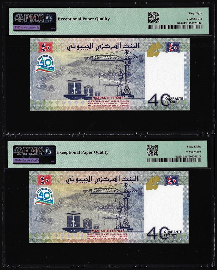 (2) Consecutive 2017 Djibouti 40 Francs Bank Notes PMG Superb Gem Uncirculated 68EPQ