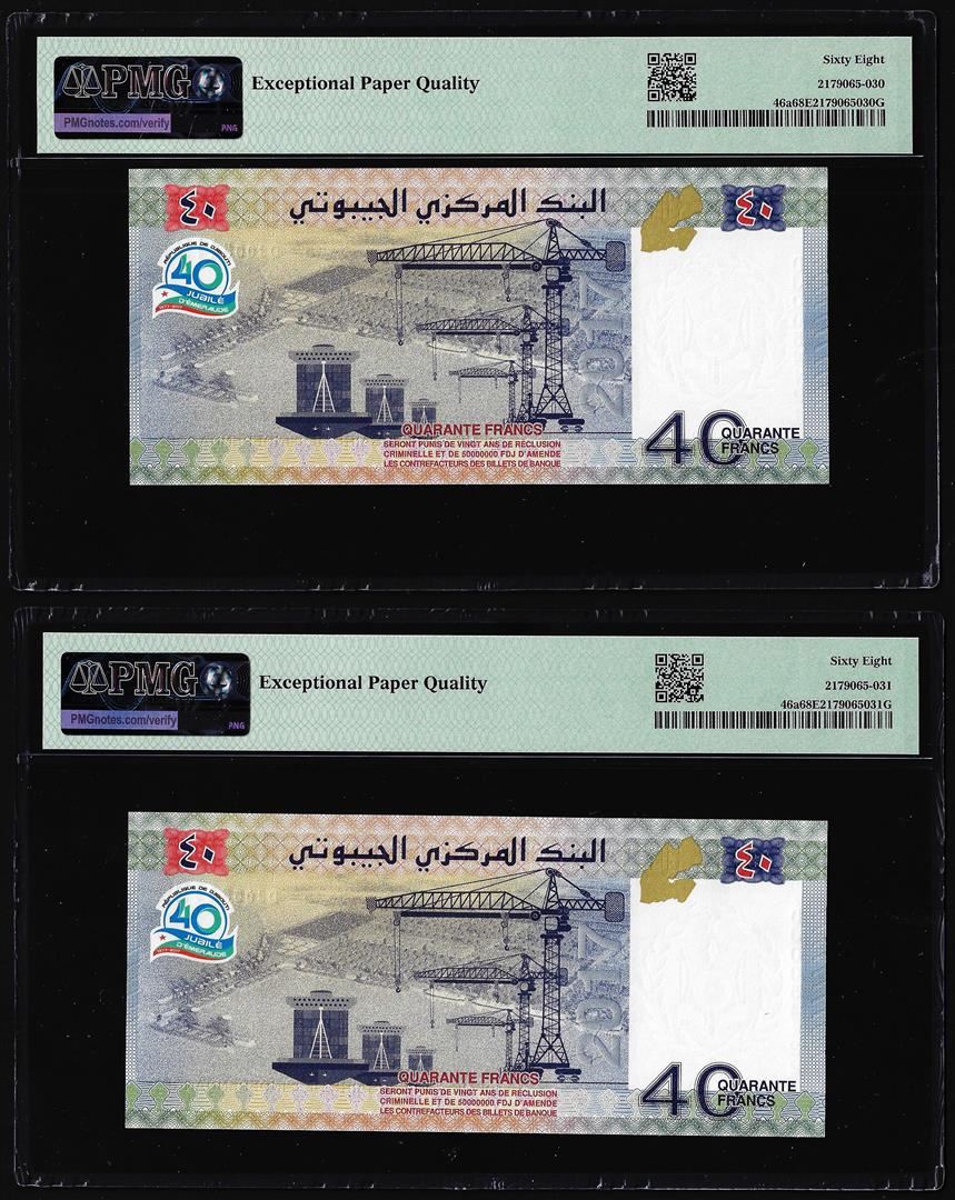 (2) Consecutive 2017 Djibouti 40 Francs Bank Notes PMG Superb Gem Uncirculated 68EPQ