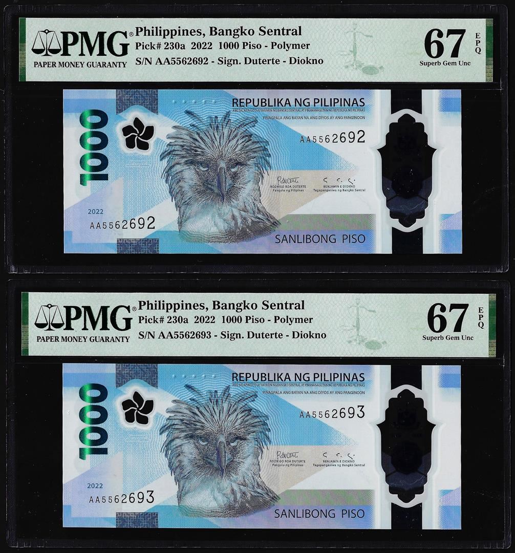 (2) Consecutive 2022 Philippines 1000 Piso Notes PMG Superb Gem Uncirculated 67EPQ