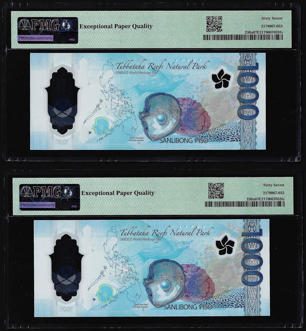 One (2) Consecutive 2022 Philippines 1000 Piso Notes PMG Superb Gem Uncirculated 67EPQ. PMG Certified.