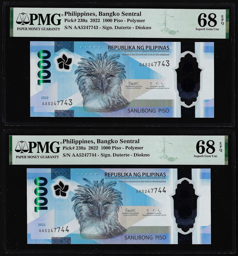 One (2) Consecutive 2022 Philippines 1000 Piso Notes PMG Superb Gem Uncirculated 68EPQ. PMG Certified.