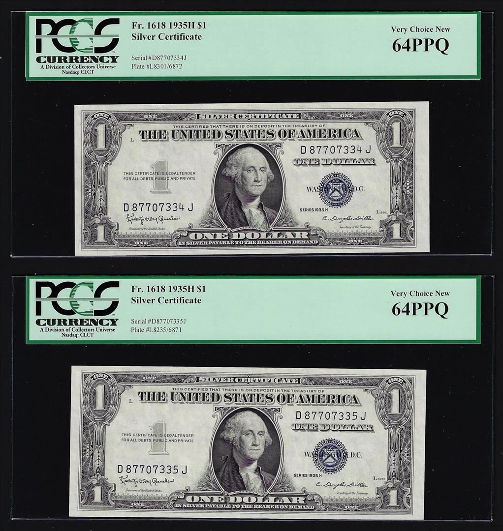 One (2) Sequential 1935H $1 Silver Certificate Notes PCGS Very Choice New 64PPQ. PCGS Graded.