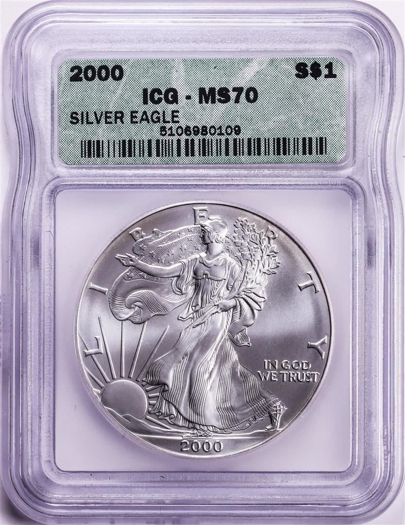 One 2000 $1 American Silver Eagle Coin ICG MS70. ICG Certified.