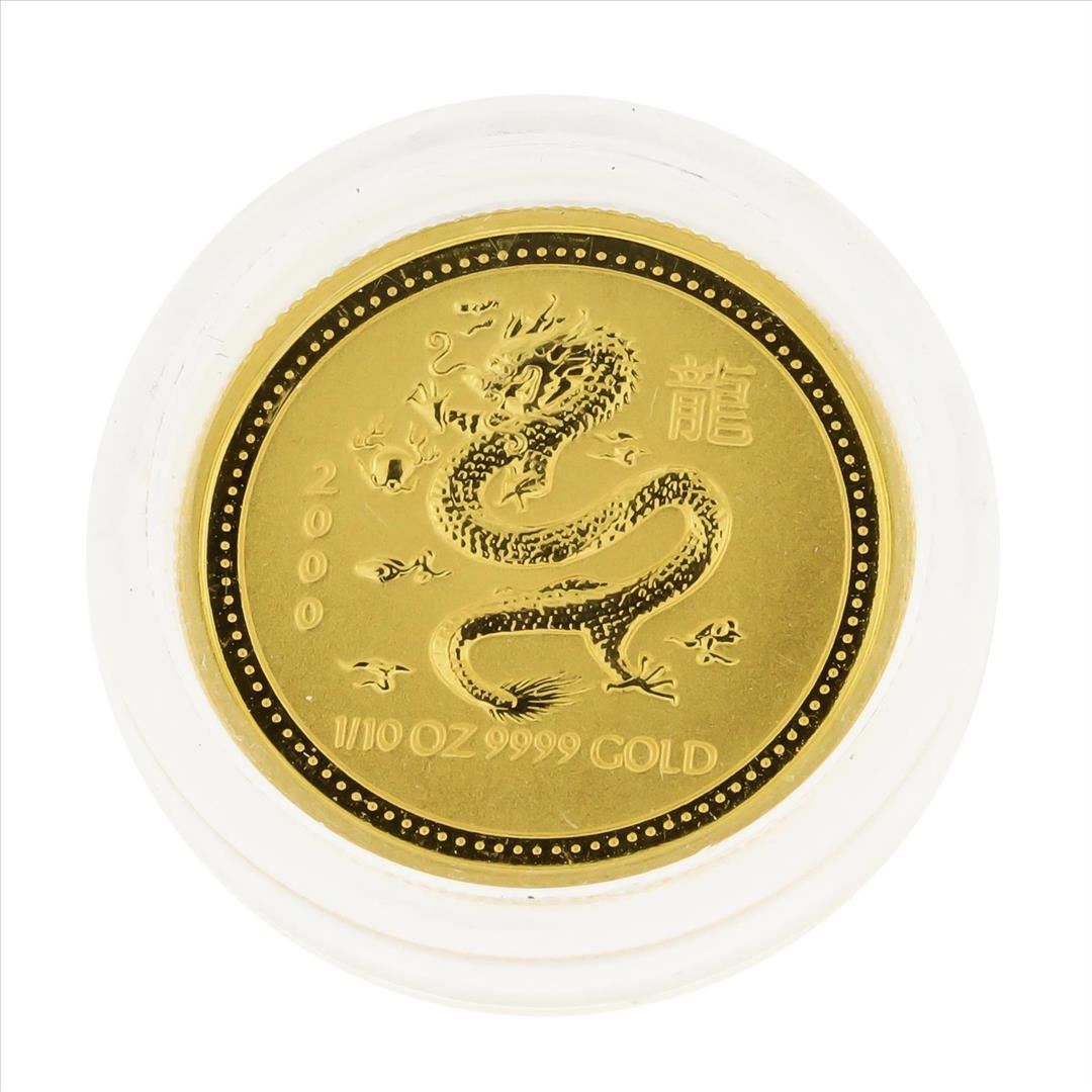 One 2000 $15 Australia 1/10 oz Lunar Year of the Dragon Gold Coin BU.