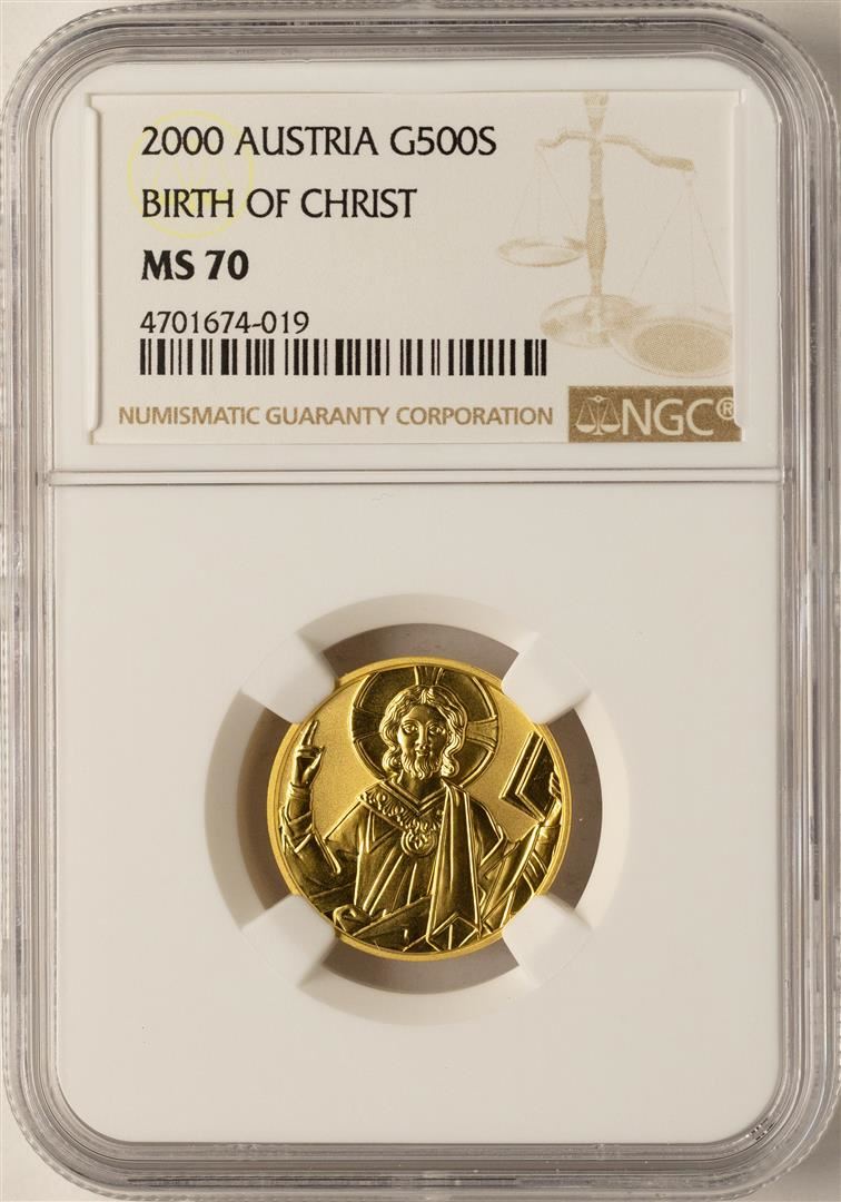 One 2000 Austria 500 Shillings Birth of Christ Gold Coin NGC MS70. NGC Certified.